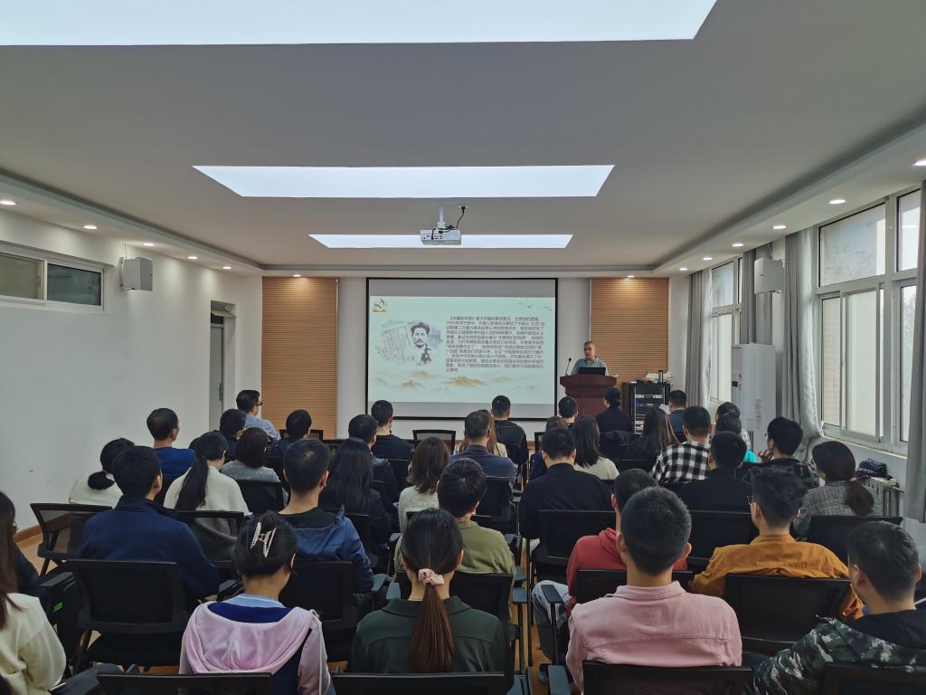 为深入学习贯彻习近平总书记“七一”重要讲话精神,扎实推进党史学习教育,进一步激发全院师生党员学习“四史”的积极性,2021年9月28日,jdb电子中国官方网站特邀请学校离退办党委书记张平老师为学院师生党员做了题为《歌声中的党史记忆》主题报告。学院全体教师党员和部分学生党员参加了报告会,报告会由学院党委书记王鸣媛主持。