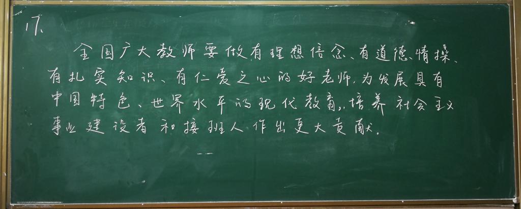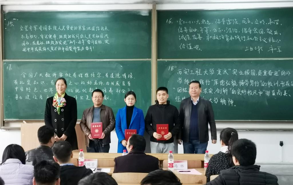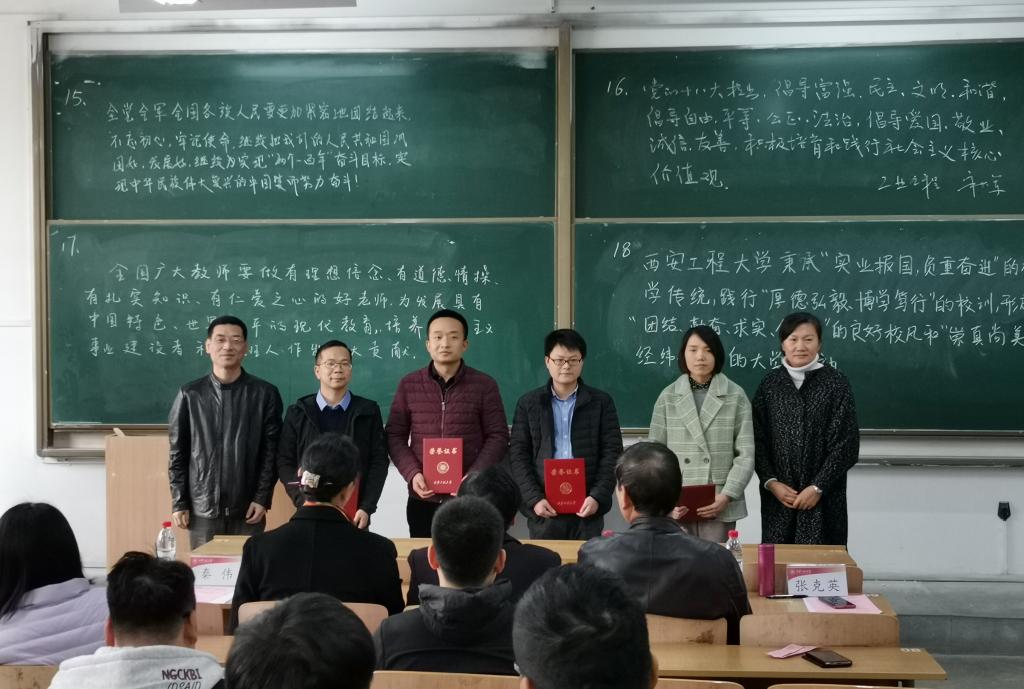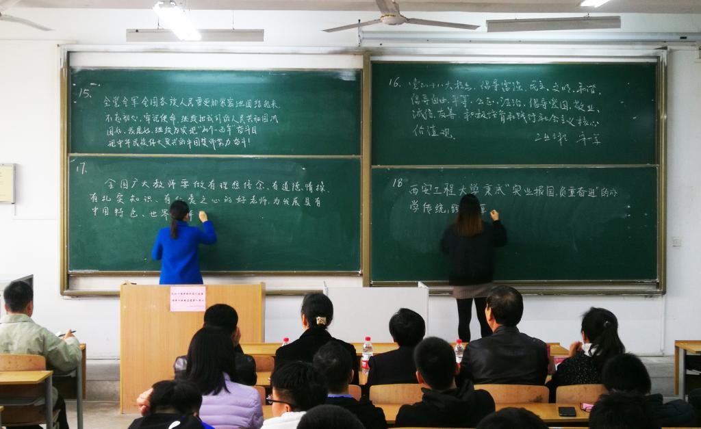 本次比赛的评委由校教学督导专家、马克思主义学院阮怀堂教授,校党委组织部正处级组织员邢瑞芳,校监察处处长冯林,校教务处副处长秦伟,校人事处副处长兼教师发展中心副主任张克英担任。18名选手按照抽签顺序,分为9组依次上台书写、展示。板书内容以“不忘初心、牢记使命”主题教育、党的十九大报告、全国教育大会、社会主义核心价值观、西安工程大学章程等为主要内容。经过评比,最终确定了各等级的获奖选手。阮怀堂和秦伟对本次比赛进行了总结与点评。阮怀堂表示,教书育人是学校的根本任务,上课是教师的第一责任。教师不仅要提高教学水平,也希望通过比赛可以促进教师粉笔板书的书写水平的提高,让学生在课堂上不仅获取知识,同时也能得到艺术的熏陶和美的传递。秦伟指出,在电子教案广泛使用的今天,提倡粉笔板书的书写是一种坚守,也是一种传承,板书比赛不仅可以提高教师板书设计能力,促进教师相互交流与学习,也是展现学校教学工作的一种形式。书写板书,一方面可以带动课堂节奏,突出教学重点;另一方面优美的板书具有个人独特的风格特点,给学生美的享受,更能给学生以思想的启迪。希望能将板书比赛坚持和传承,进一步丰富比赛形式和内容,提高教职工的参与度,提升教学素养。