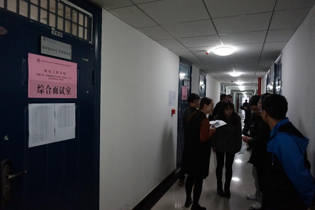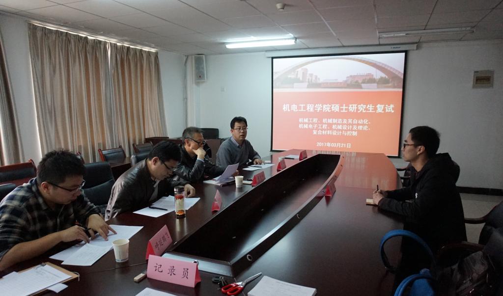 根据《西安工程大学2017年硕士研究生复试录取办法》的要求,3月21日,机电学院组织开展了2017年硕士研究生复试工作,复试分两部分进行,一是由校研究生部组织进行统一笔试,二是由各学院组织学生进行面试。为了做好学院2017年硕士研究生招生调剂、复试与录取的工作,学院成立了2017年硕士研究生招生复试与录取工作领导小组,学院院长胥光申任组长,党委书记杨永革、院长助理苏晓磊任副组长,成员由学院党委副书记魏哲、院长助理肖渊和学院纪检委员金守峰组成,具体工作由苏晓磊和研究生秘书马林负责实施。