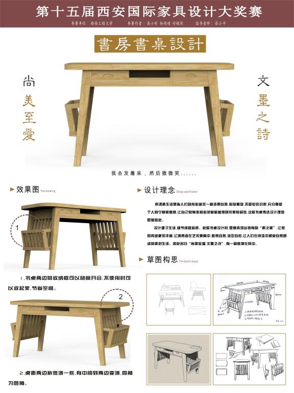 本次大赛有来自西安工程大学、西安交通大学、西北大学、西北工业大学等20所院校的设计、环艺、艺术系师生和西安来福家具研究所及广大设计师和家具爱好者参加,由jdb电子机电学院教师张小平指导的高小针、杨婧婧、付艳秋等3位同学的作品《尚文书桌》荣获新式书桌设计金奖,米伟明等38位同学荣获优秀奖,教师张小平荣获优秀指导教师奖,同时,jdb电子也是参赛院校中获奖最多的学校。
