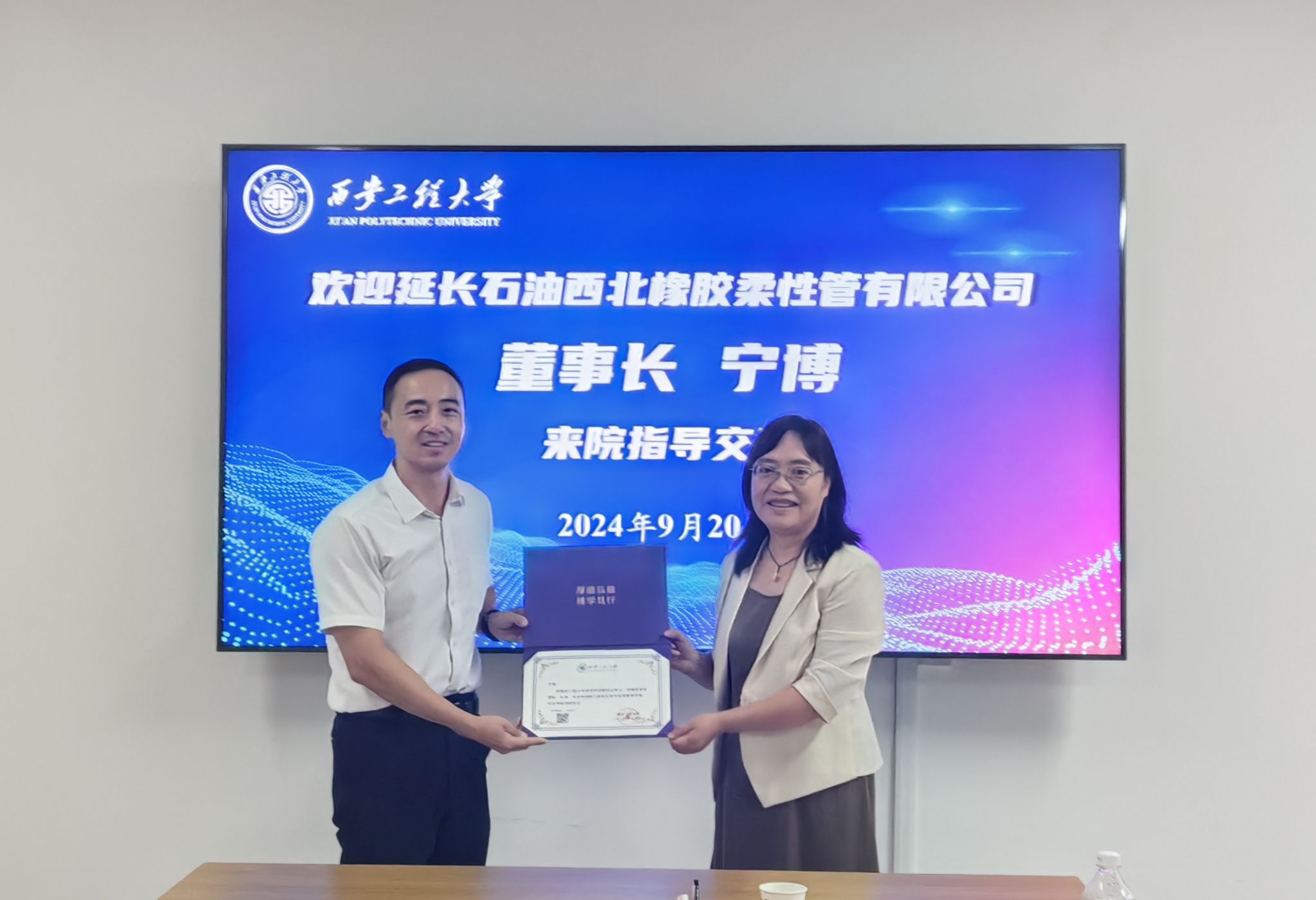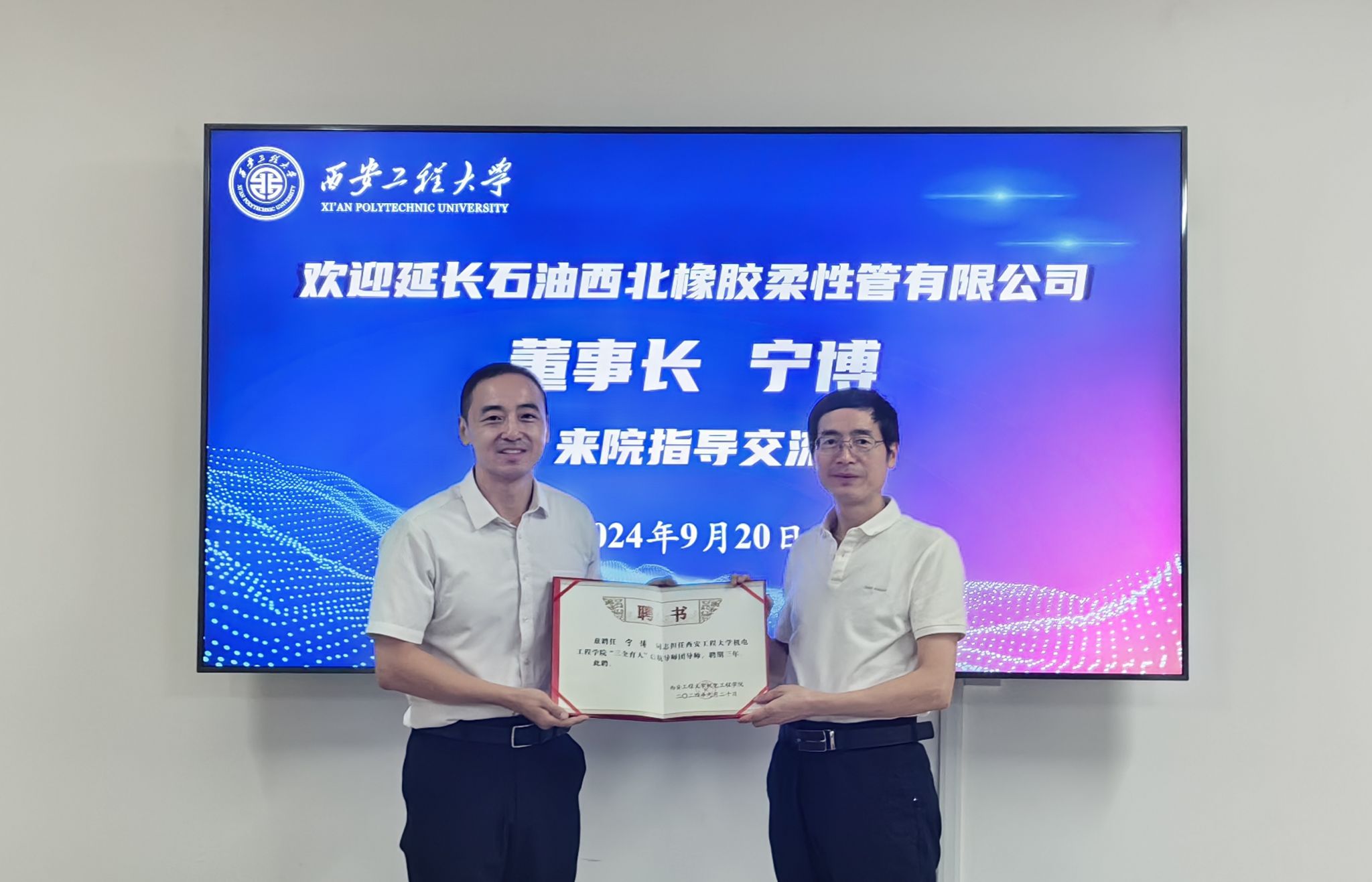 2024年9月20日,jdb电子中国官方网站举办校外指导教师受聘仪式暨“三全育人”导师分享交流会,陕西延长石油西北橡胶柔性管有限公司董事长宁博,西安工程大学人事处副处长魏哲,jdb电子中国官方网站党委书记阚佩、院长赵小惠、党委副书记冯翊、副院长肖渊、副院长付翀参加受聘仪式,仪式由学院党委书记阚佩主持。