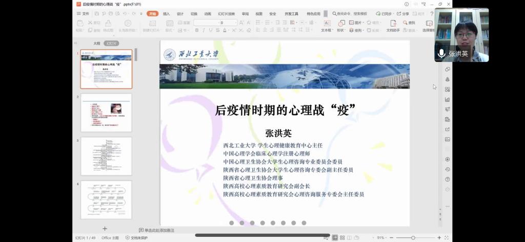 2020年4月24日,jdb电子中国官方网站举办2019-2020学年第二学期心理委员培训会,活动邀请西北工业大学学生心理健康教育中心主任张洪英副教授作了题为《后疫情时期的心理战‘疫’》专题报告,机电学院各年级辅导员以及心理委员参加了本次活动,活动由学院心理辅导员秦方刚主持。