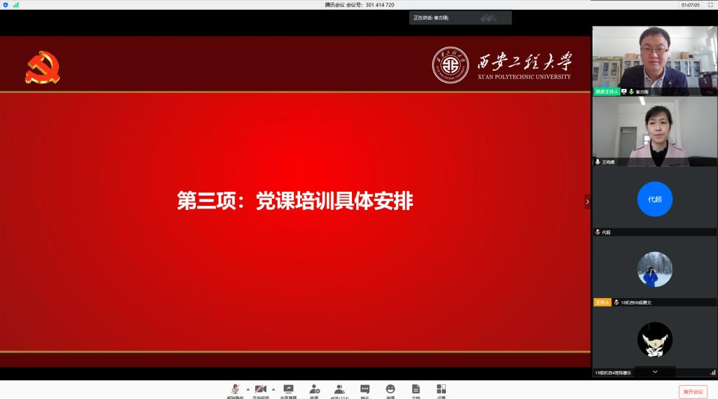 王鸣媛带领大家共同学习了“三秦楷模”施秉银、付凡平同志和赵梦桃小组的先进事迹,号召全体同学认真学习他们坚守初心使命、永远奋斗的优秀品格,学习他们舍身忘我、矢志奉献的崇高境界,学习他们恪尽职守、埋头苦干的朴实作风,学习他们勇于担当、冲锋在前的拼搏精神,在关键时刻站得出来、危急关头顶得上去的担当作为。她通报了学院教师党员在疫情防控过程中的履职尽责情况、师生党员自愿为抗击疫情捐款情况和学生志愿者积极投入到疫情防控第一线的志愿活动开展情况,要求培训班全体学员在今后的学习和生活中,更加严格要求自己,加强自身修养,发挥先锋模范作用;脚踏实地,不断锤炼个人作风,端正入党动机,争取从思想上和行动上早日入党。