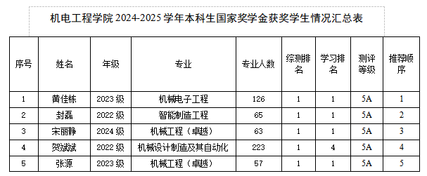 jdb电子中国官方网站评选工作经前期通知安排、学生本人申请、班级民主评议、年级推荐、学院资格初审、现场公开答辩、学院学生资助工作小组综合考察,并经学院党政联席会议研究决定,推荐以下五名同学为2024-2025学年本科生国家奖学金候选人选,现将名单及信息公示如下: