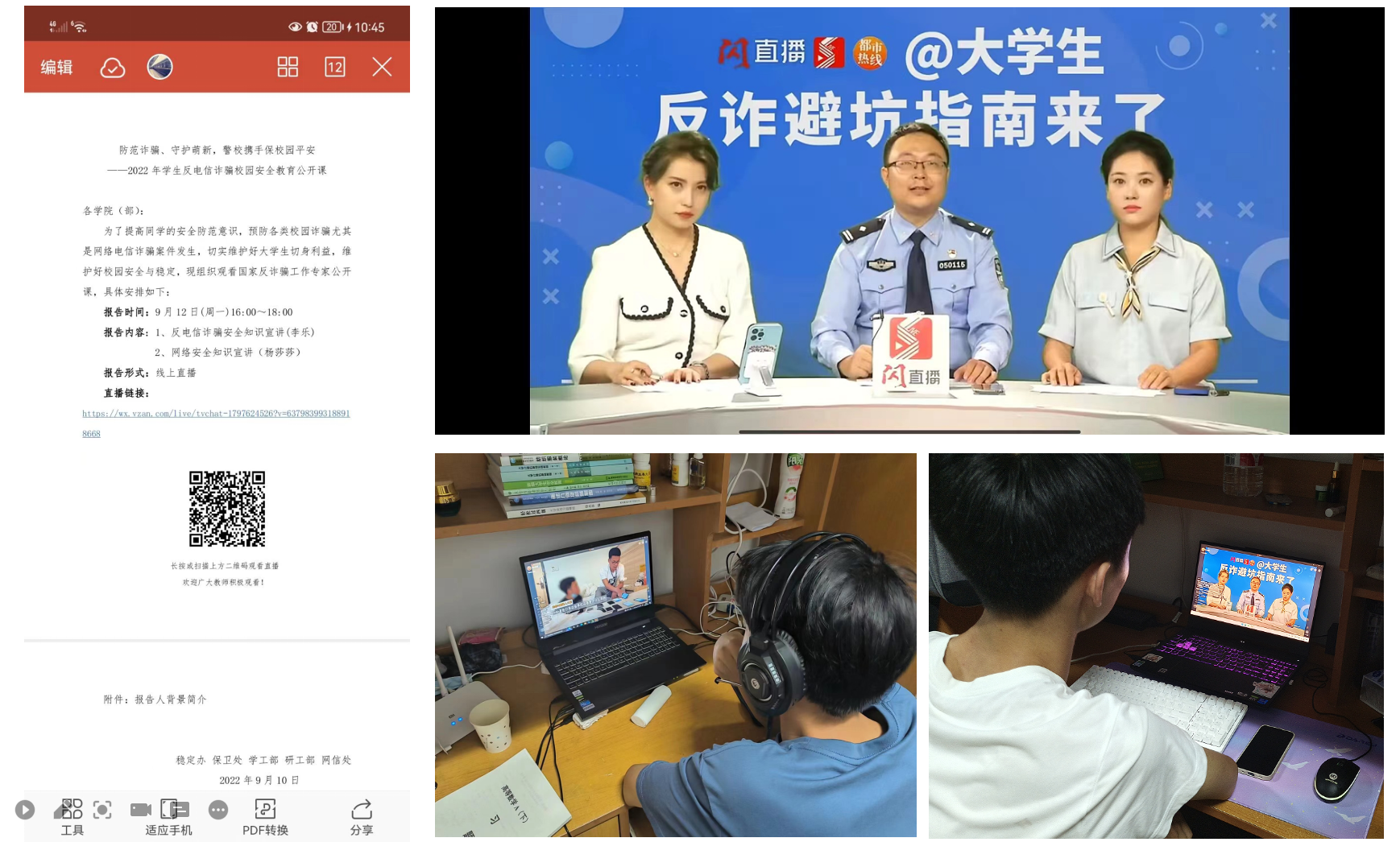 9月9日、12日、14日,学院积极组织2022级新生收看由市公安局等部门联合举办的【@大学生反诈避坑指南来了】主题线上直播活动,由西安工程大学举办的《防范诈骗、守护萌新,警校携手保校园平安——2022年学生反电信诈骗校园安全警示公开课》,由jdb电子中国官方网站举办的《开学季防诈防骗知识宣讲会》《新生安全教育》,通过众多典型案例,不断提升学生安全防范意识,预防各类校园诈骗案件发生,切实维护好大学生切身利益,维护好校园安全稳定。9月12日,学院邀请大学生心理健康教育与咨询中心副主任田珍珍从新生面临的三大变化、新变化带来的新冲突、新生心理调适方法集锦等3个方面做了大学新生心理适应的专题报告,同学生感兴趣的话题进行了深入互动,帮助新生明确方向,从“心”保驾护航。