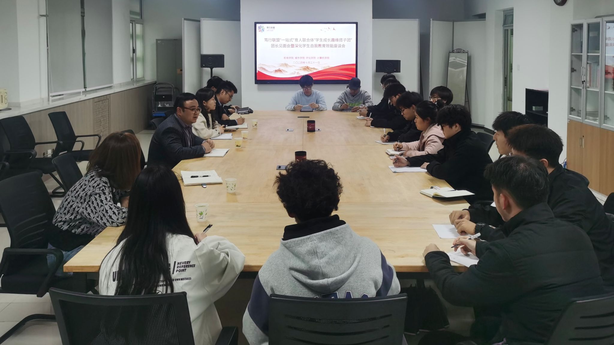 10月31日,笃行联盟“一站式”育人联合体开展“学生成长趣缘搭子团”团长见面会暨深化学生自我教育效能座谈会。机电学院党委副书记冯翊、城市学院党委副书记鱼园、“学生成长趣缘搭子团”负责老师以及15个“学生成长趣缘搭子团”团长参加了会议。会上,机电学院党委副书记冯翊就“学生成长趣缘搭子团”成立的背景、意义以及目的做了详细阐述。“学生成长趣缘搭子团”负责老师就团队运行机制、考核机制、保障机制等做了重点解释。“学生成长趣缘搭子团”团长就各自团队的基本情况和特色做了详细介绍。同时,负责老师就学生提出的问题进行了一一解答,并就后续工作的开展达成共识。